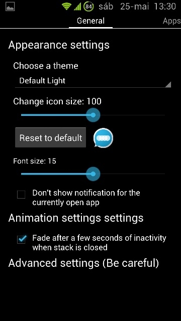 7 - Clique no botão voltar e você verá que estará nas configurações do aplicativo. Caso não esteja, basta localizar o aplicativo em seu App Drawer e executá-lo. Nas configurações você poderá definir o tamanho do ícone, o tamanho da fonte das letras, se o fundo das mensagens será claro ou escuro. Ao deslizar o dedo na tela da direita para a esquerda você será direcionado a configuração que permite escolher quais os aplicativos utilizarão o Floating Notifications para notificações. Dessa forma você poderá adiconar o seu Facebook, o Hangouts, o Gmail, o aplicativo de SMS, etc e ter suas notificações todas flutuando;
