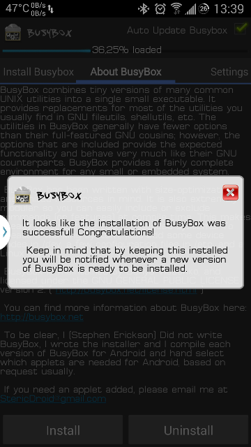 1 - Baixe o Instalador do Busybox pelo Google Play Storee execute-o. Clique em "Install" e aguarde surgir o aviso de que a instalação foi realizada com êxito: