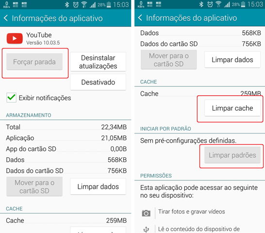 5 - Não abra o aplicativo do Youtube ainda. Vá me "Configurações", em seguida em "Gerenciador de Aplicações" e forçe a parada do Youtube clicando em "Forçar Parada". Em seguida clique em "Limpar Cache" e "Limpar Padrões" (conforme está assinalado em vermelho nas imagens abaixo: