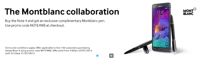 A Samsung no Reino Unido está oferecendo uma caneta Montblanc de cortesia na compra de um Samsung Galaxy Note 4. Os clientes terão que comprar o dispositivo a partir do site da Samsung UK. Não é especificado qual dos modelos da caneta da Mounblanc será oferecido junto com o aparelho