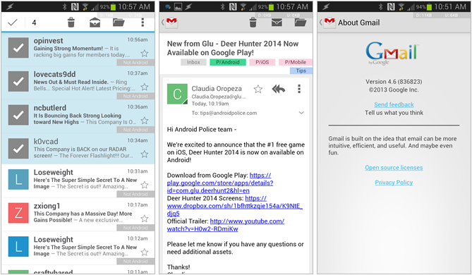 Alguns aparelhos estão recebendo agora no mês desetembro de 2013 a atualização para o GMail 4.6 que traz algumas mudanças em relação ao GMail 4.5 liberado em junho de 2013.
